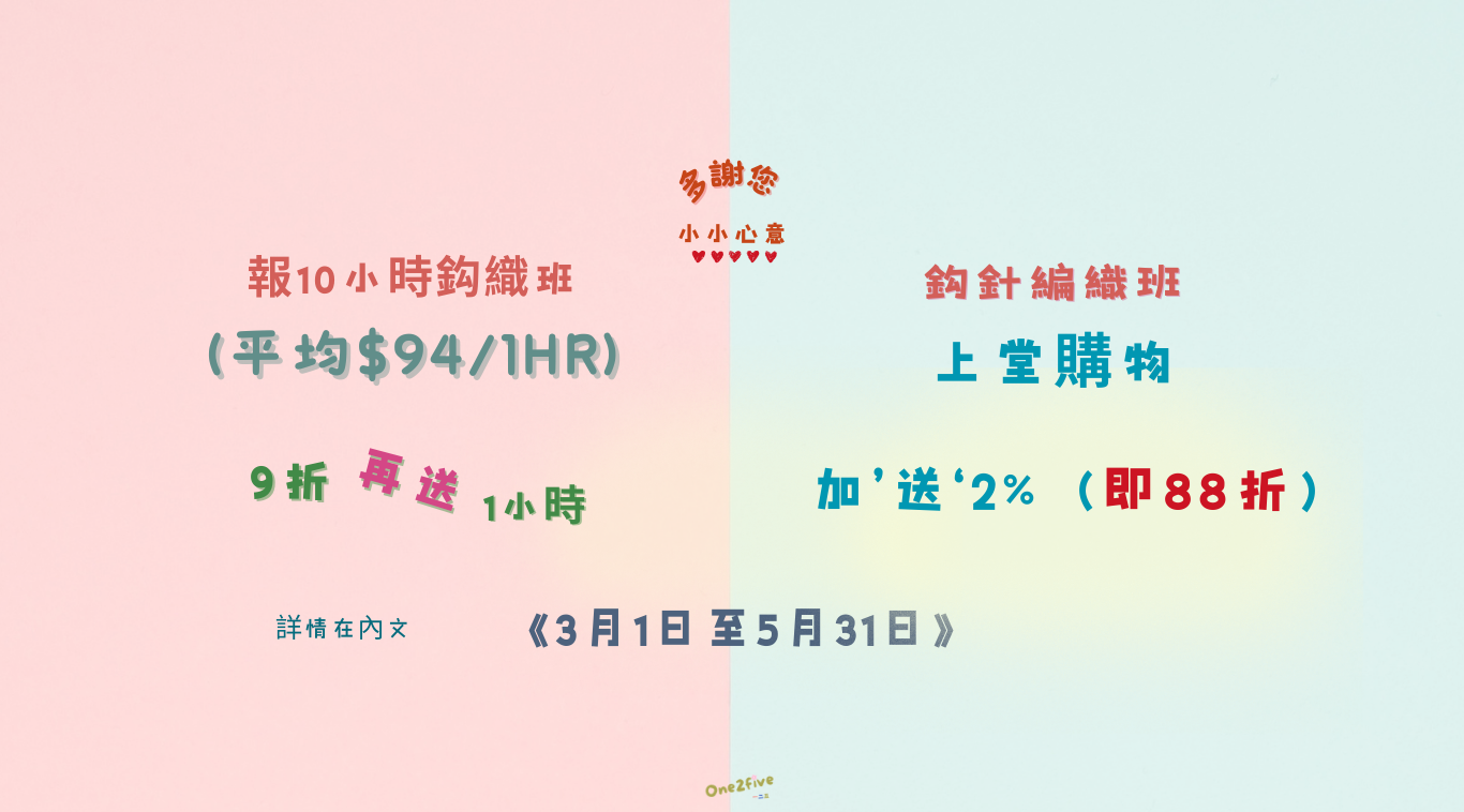 鈎針編織自由班: 一次過報10小時 可獲9折 (可7個月內使用) - 5月31日前再加送1小時